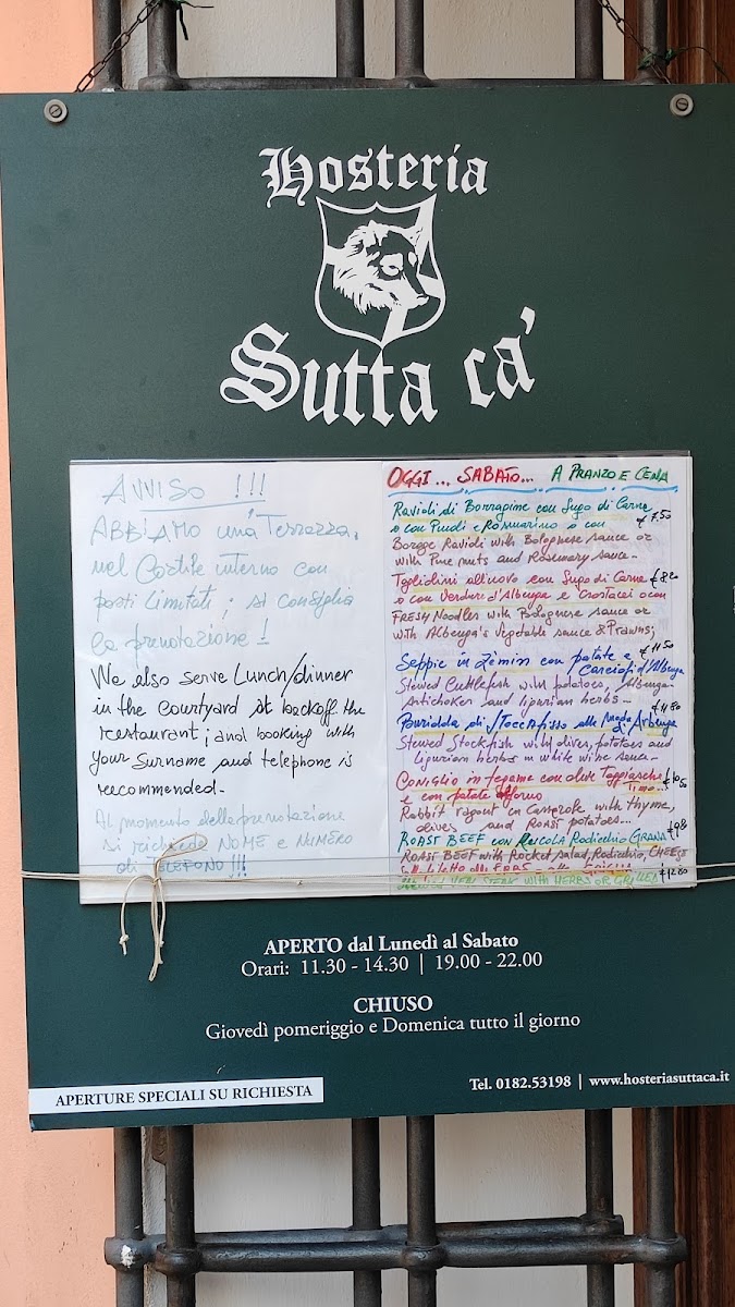 Hosteria Sutta Ca' is a hidden gem located in the heart of Albenga, Italy, offering an authentic taste of Ligurian cuisine. This charming eatery, described by patrons as more akin to a welcoming family home than a restaurant, prides itself on homemade dishes and friendly service. The menu changes daily, ensuring a fresh and delightful culinary experience each visit. Highlights include the must-try rabbit roulade and the heavenly budino, reminiscent of caramel panna cotta. Visitors consistently rave about the warm hospitality and commitment to quality, making Hosteria Sutta Ca' a beloved staple in the local dining scene.